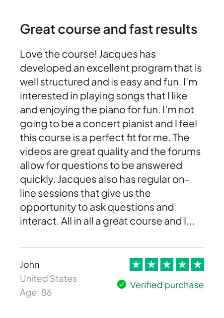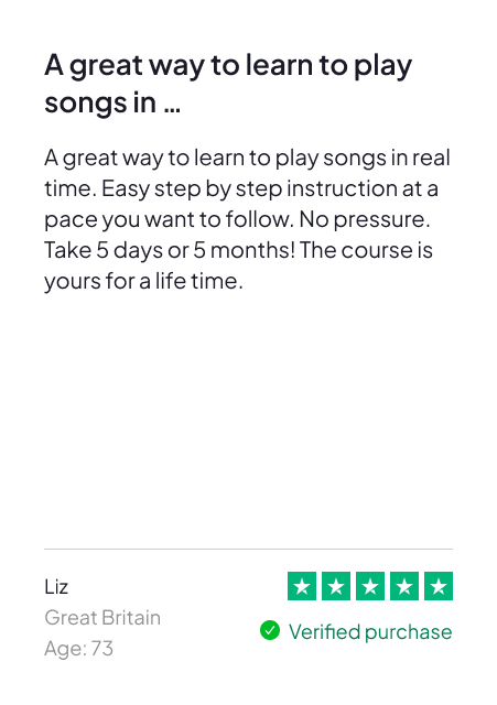 • Play Real Songs in 5 Days Guarantee — Love it or it’s FREE: follow the plan and if you can’t play full songs you love with both hands by Day 5, we’ll refund you (see Guarantee below)