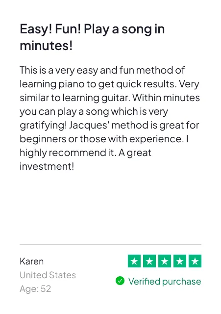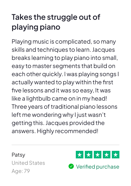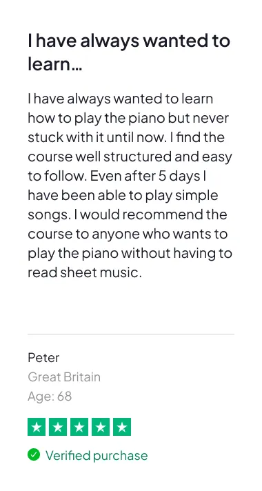 This is a 5-day, self-paced online challenge designed for adults who want to start playing real songs on piano — fast. You’ll follow the exact process that’s helped over 200,000 adults go from “total beginner” to confident player — without reading sheet music, memorizing theory, or wasting hours on complicated apps.