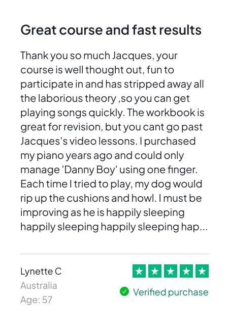 Follow the 5-day plan, and if you’re not playing full songs with both hands by Day 5—or you simply don’t feel it was worth $27— email us and we’ll refund you. No forms. No proofs. No hard feelings.