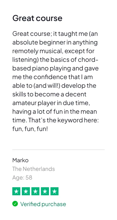 Just 15–20 minutes per day is enough to see real progress. The lessons are short and focused, and you’ll always know exactly what to practice (thanks to the workbook and calendar). This is built for busy adults — not full-time music students.