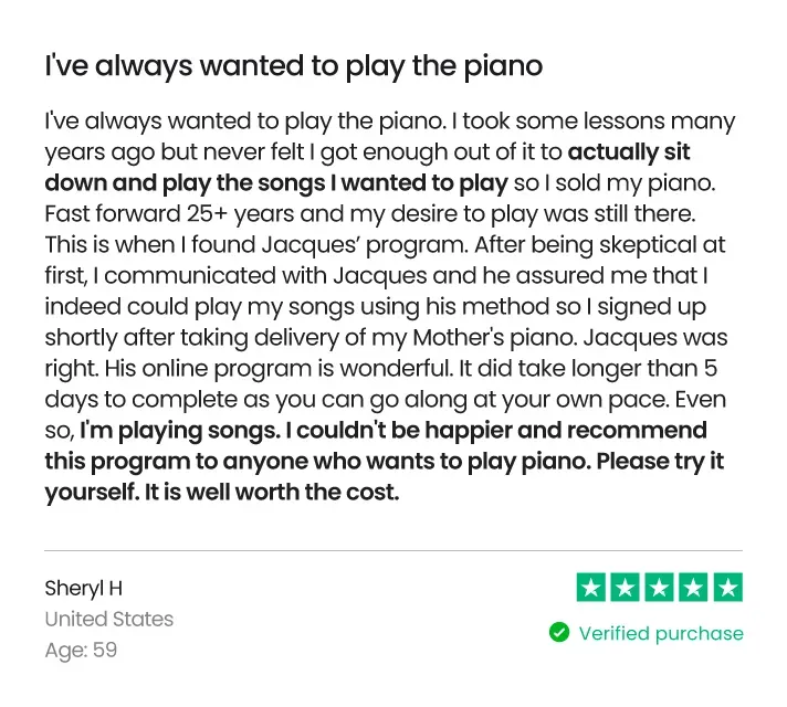 We offer a 100% “Play Real Songs in 5 Days” money-back guarantee. If you’re not playing full songs with both hands by Day 5, or you’re not thrilled, email us and we’ll refund you.